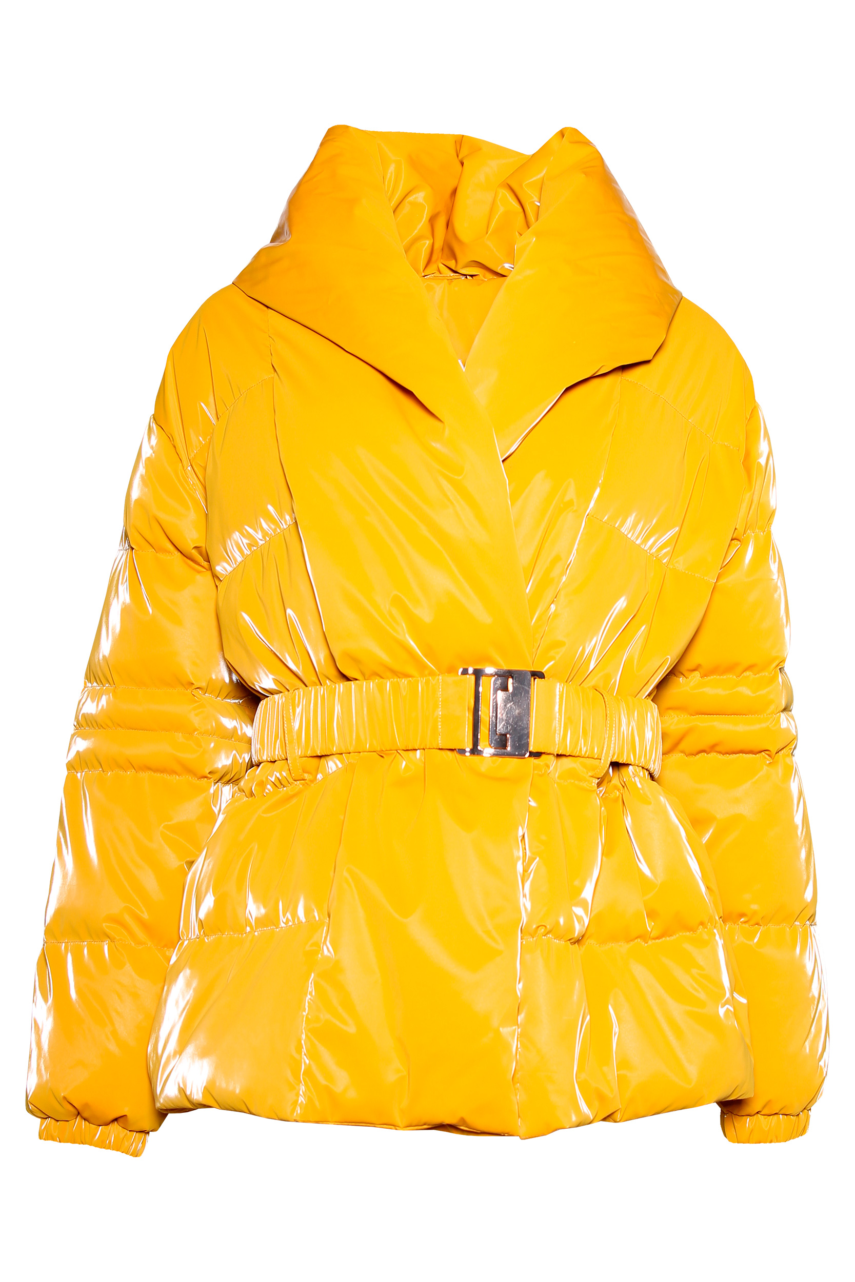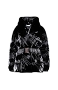 Casaco acolchoado com gola de rebuço. Cinto no mesmo tecido com fivela em metal. Manga comprida com punhos com elástico. Bolsos na lateral com fecho de correr. Fecho na frente com molas de pressão.