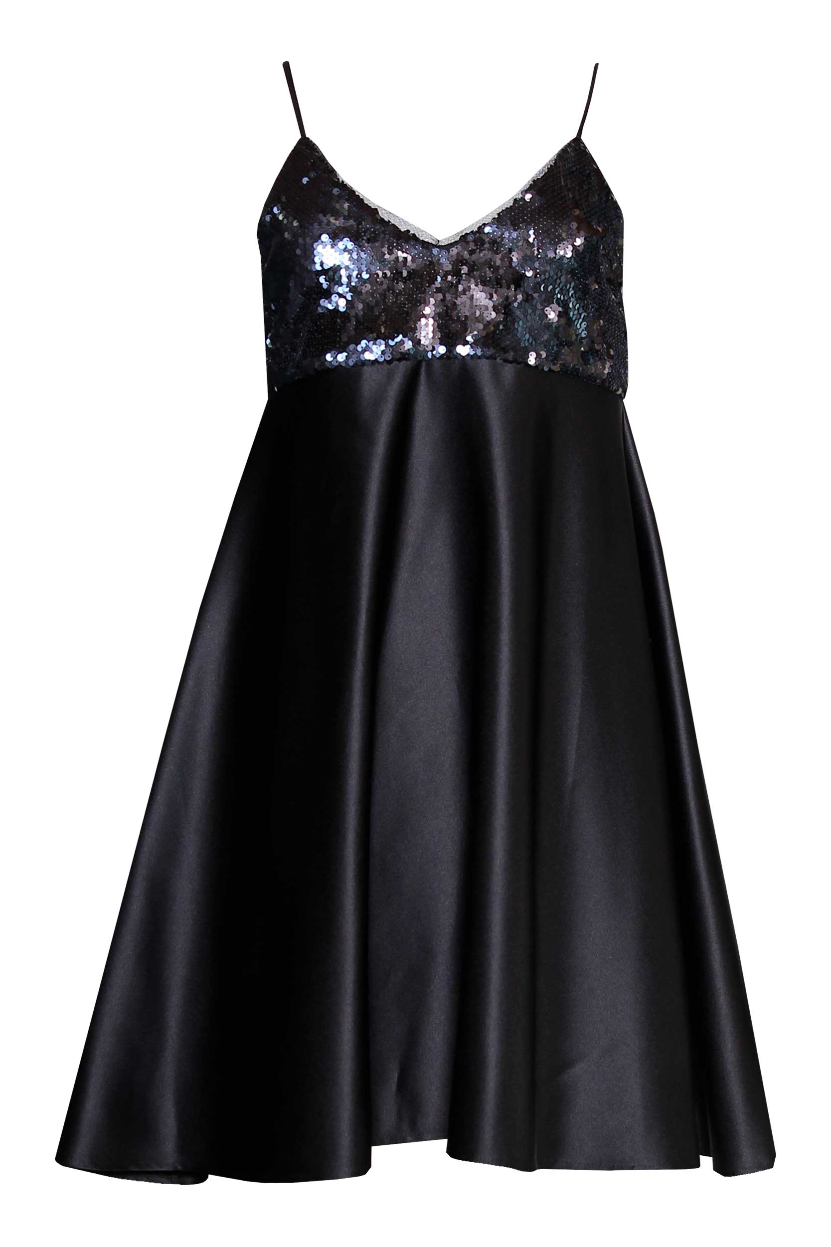 Vestido decote em bico e de alças finas. Tecido com efeito acetinado e com lantejoulas na parte superior.