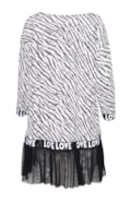 Vestido com aplicação de fita decorativa nos punhos e na parte inferior. Folhos em tule a contrastar. Estampado na frente.