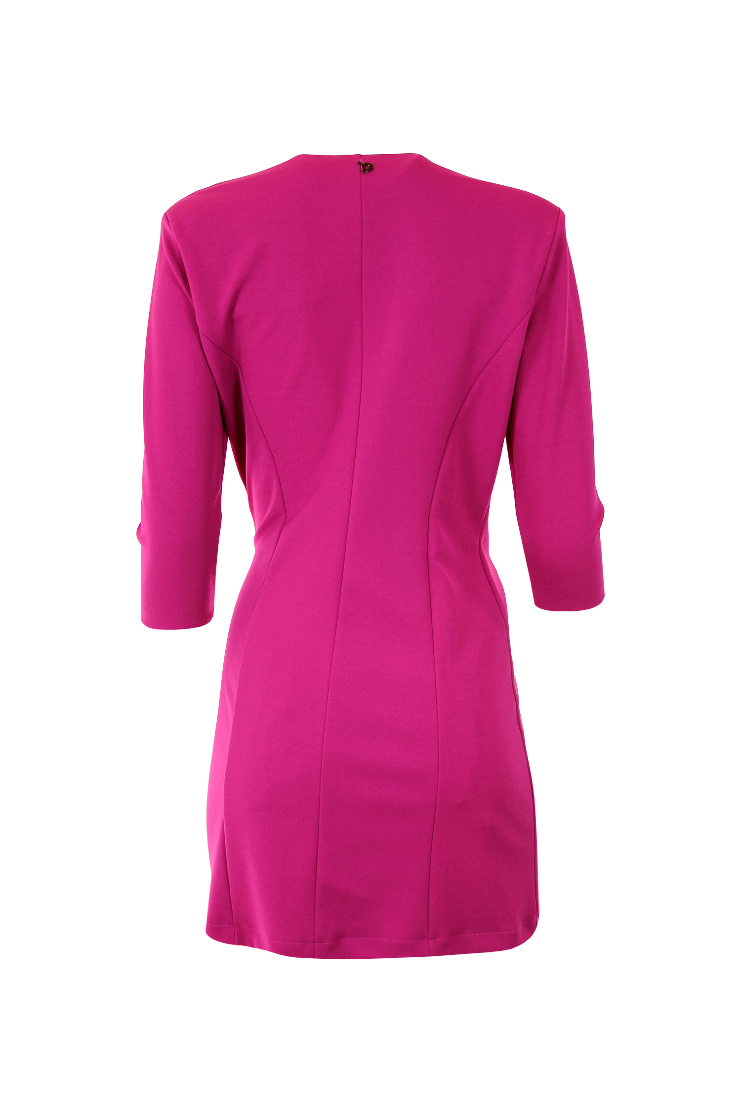 Vestido curto drapeado com fivelas metálicas. Decote em v e mangas 3/4.